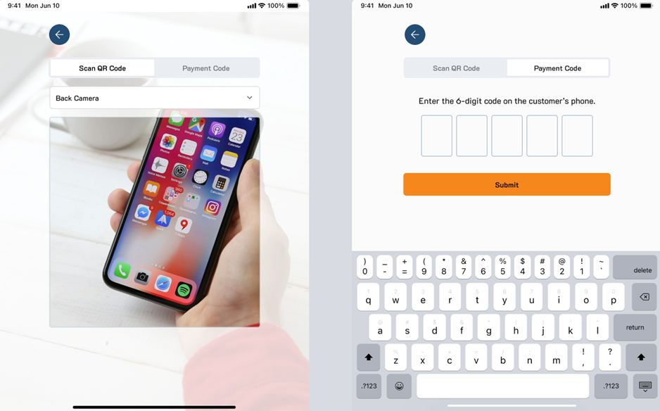 5. Click “Checkout” to launch the camera and scan QR code or enter the six digit payment code.