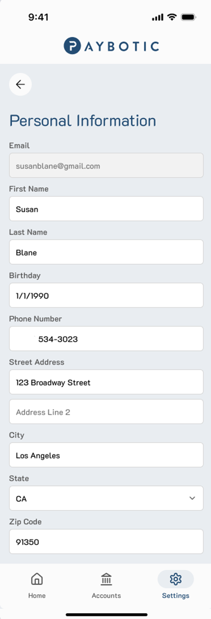 i. The email address is associated with your account’s login information. If you would like to update your account’s email address, please contact Paybotic Financial support through the “Contact Support” section of your account’s portal or by email,